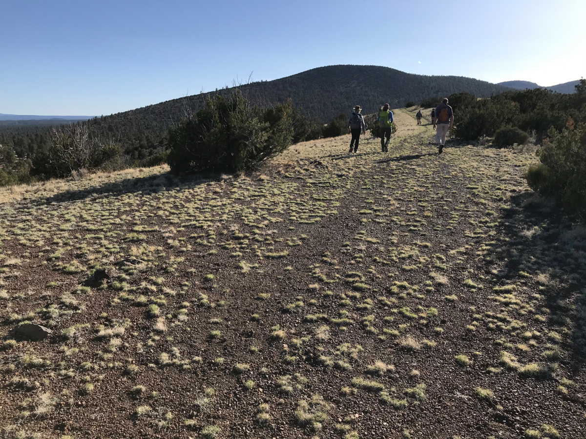 Descending down to the vehicles. Note the ponderosa pine trees in the valley below. This elevation marks the boundary between the ponderosa and Pinyon-Juniper eco-zones. Next on the tour is the Turkey Hills.