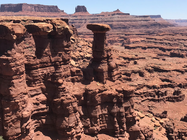 Turning the other direction is where runoff spills off of the White Rim and cascades down in a pour-off below. The scale of features everywhere is astounding. The drop here is about 300 feet straight down.